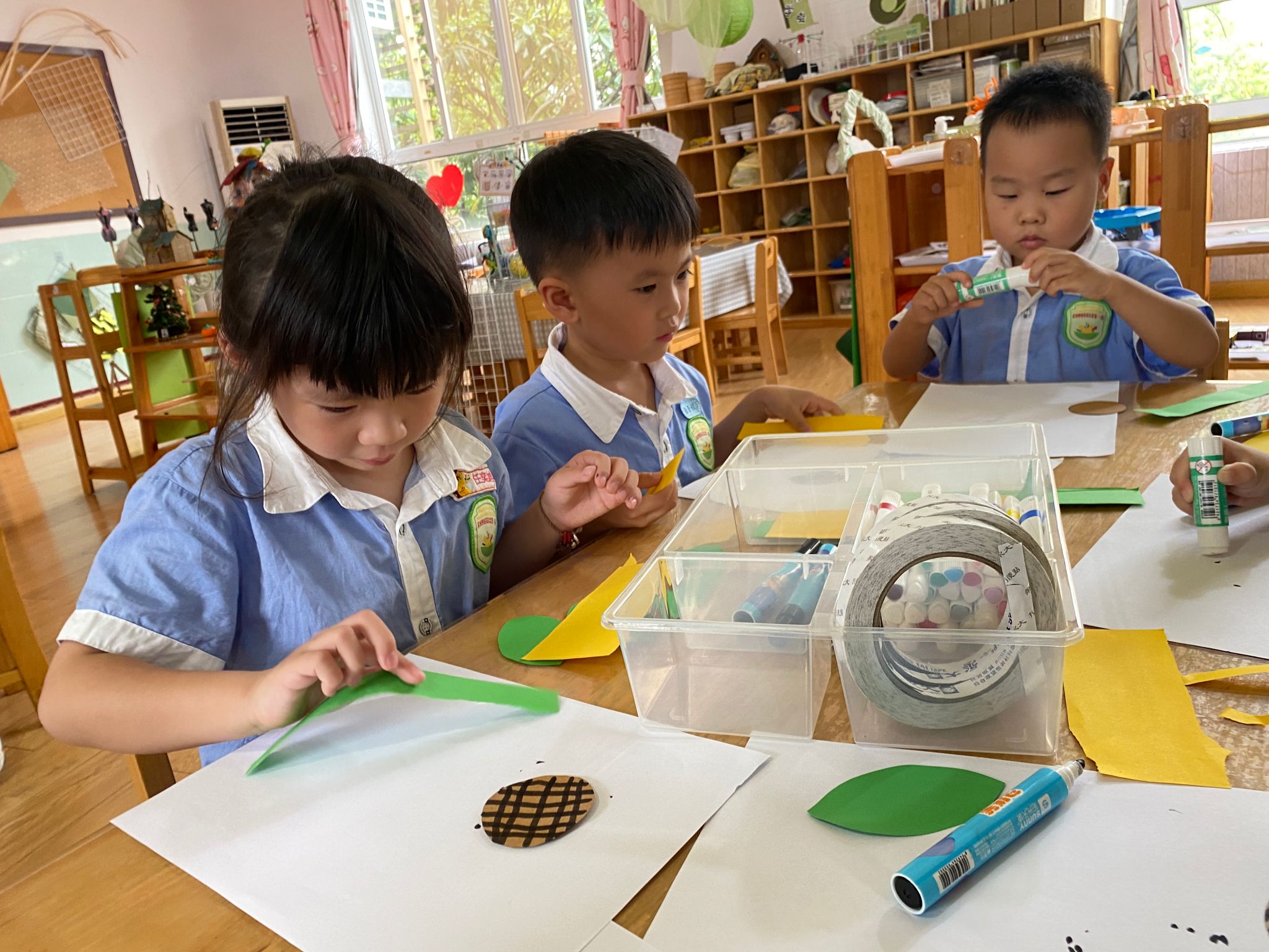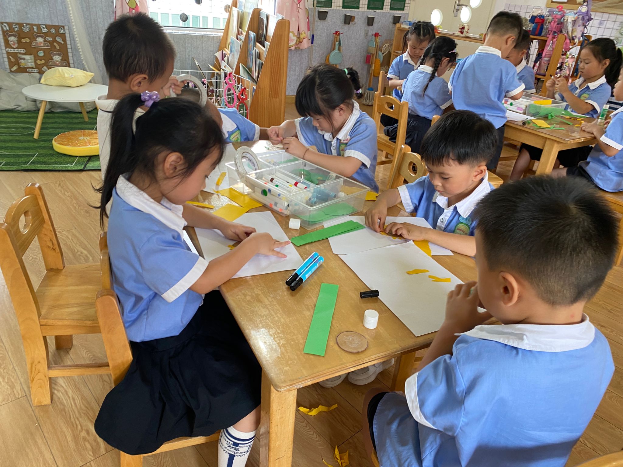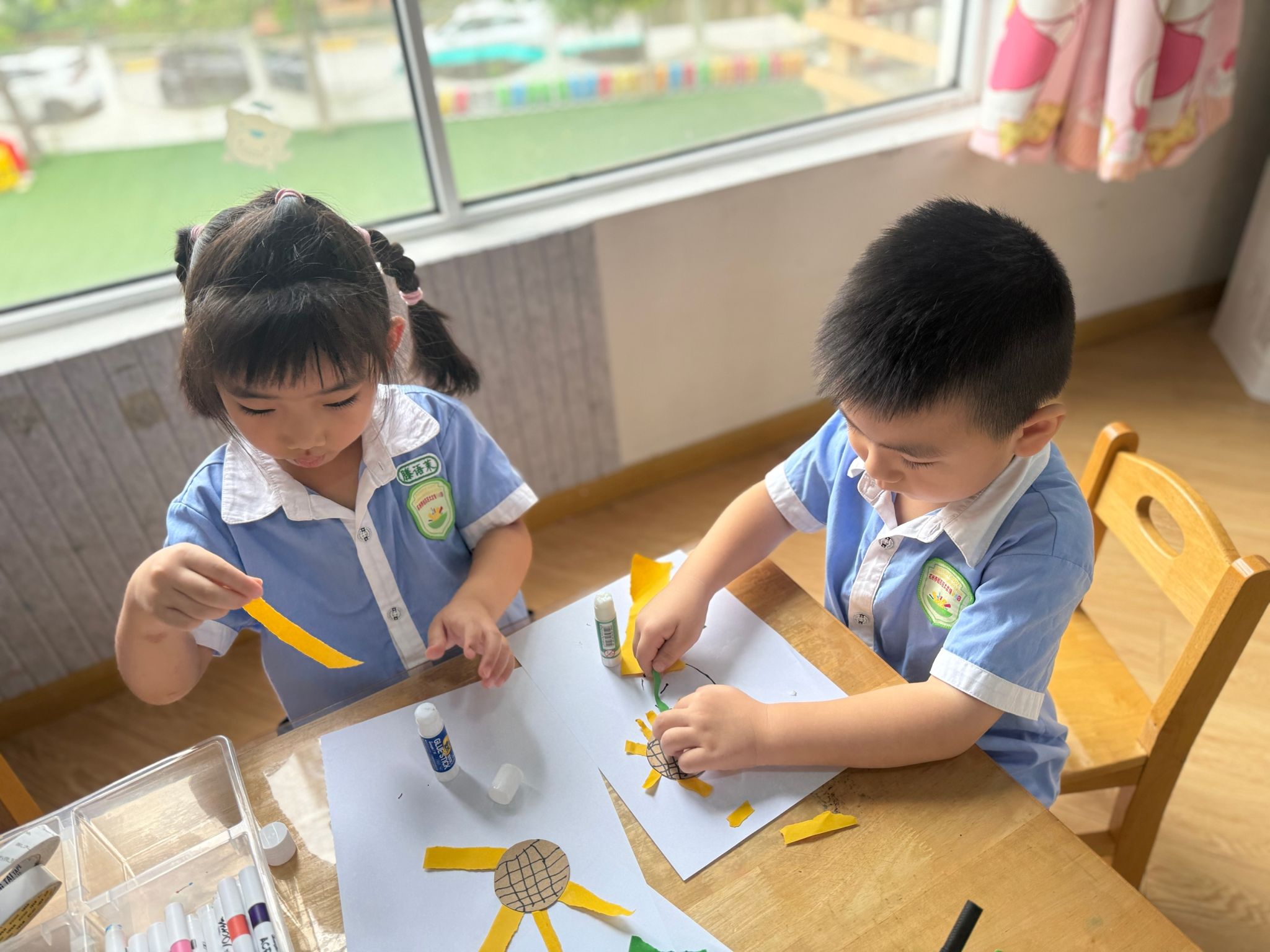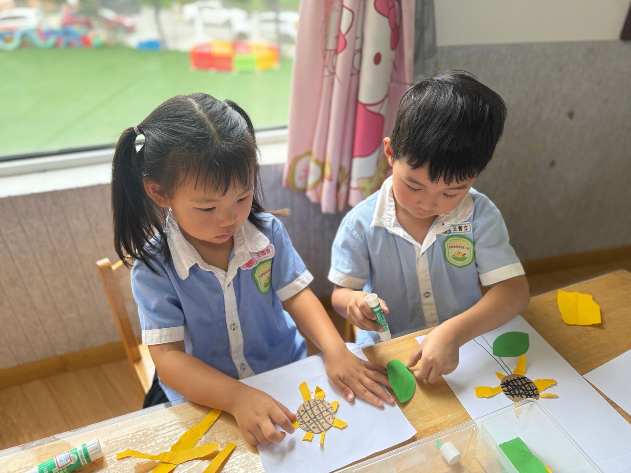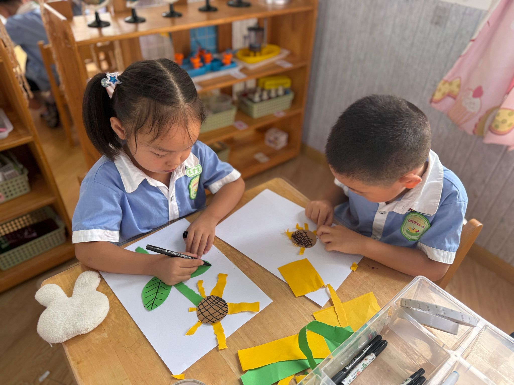 最热闹的当属手工环节。孩子们化身“小小设计师”,用彩纸撕出金黄的向日葵花瓣,粘贴出翠绿的花茎与叶片,再一笔一画添上装饰。老师巡回指导,耐心教孩子们握剪刀、贴卡纸,鼓励大家发挥创意,让每一朵“向阳花”都独一无二。