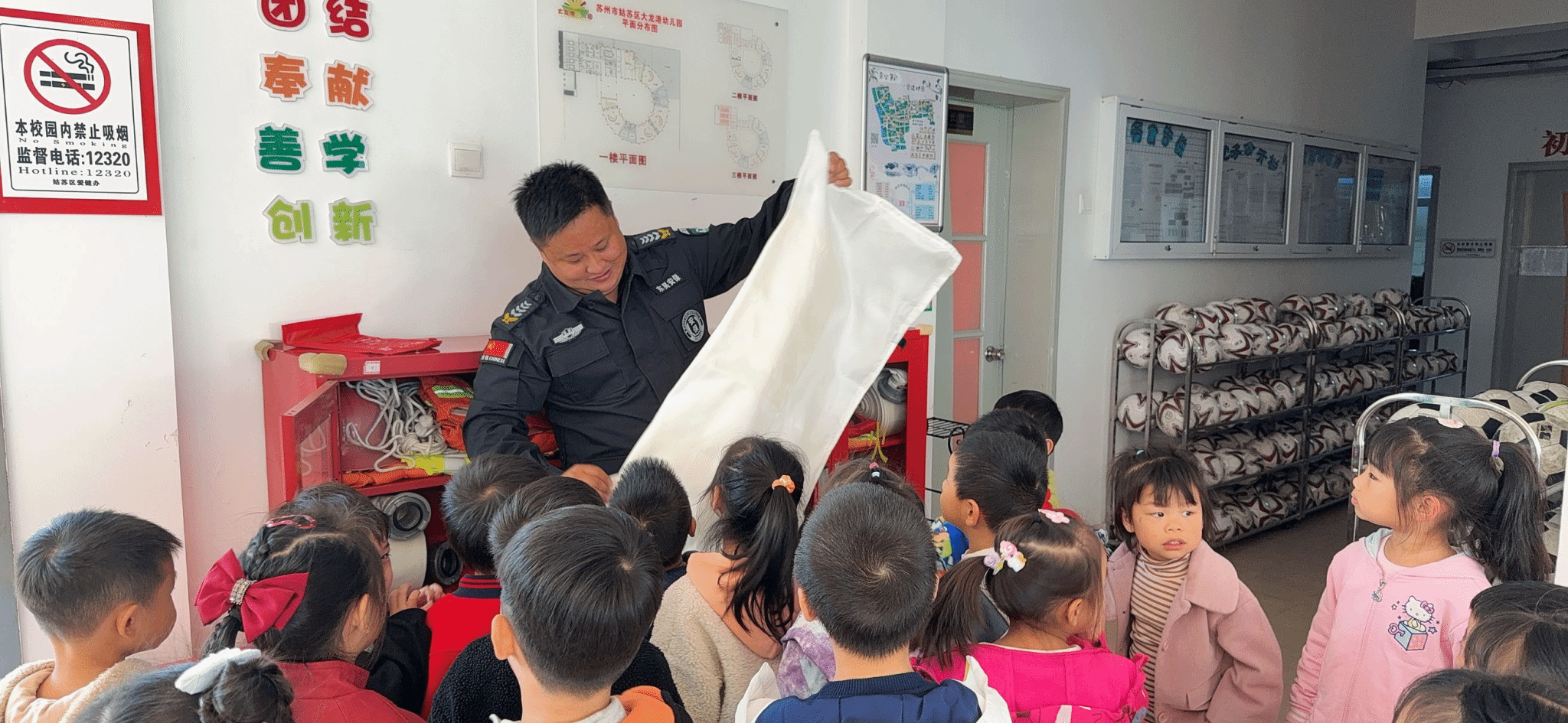 在老师的指导下,宝贝们还分组体验了“模拟灭火”“戴消防面具”等项目。宝贝们瞬间变身“小小消防员”,脸上洋溢着自豪。