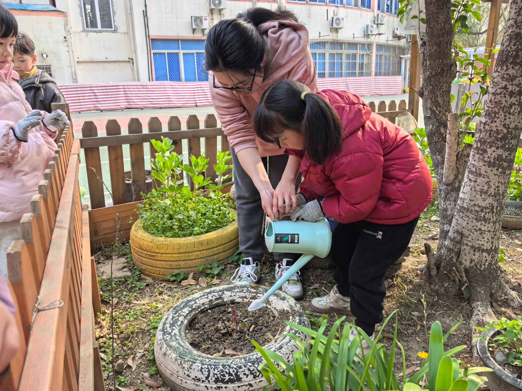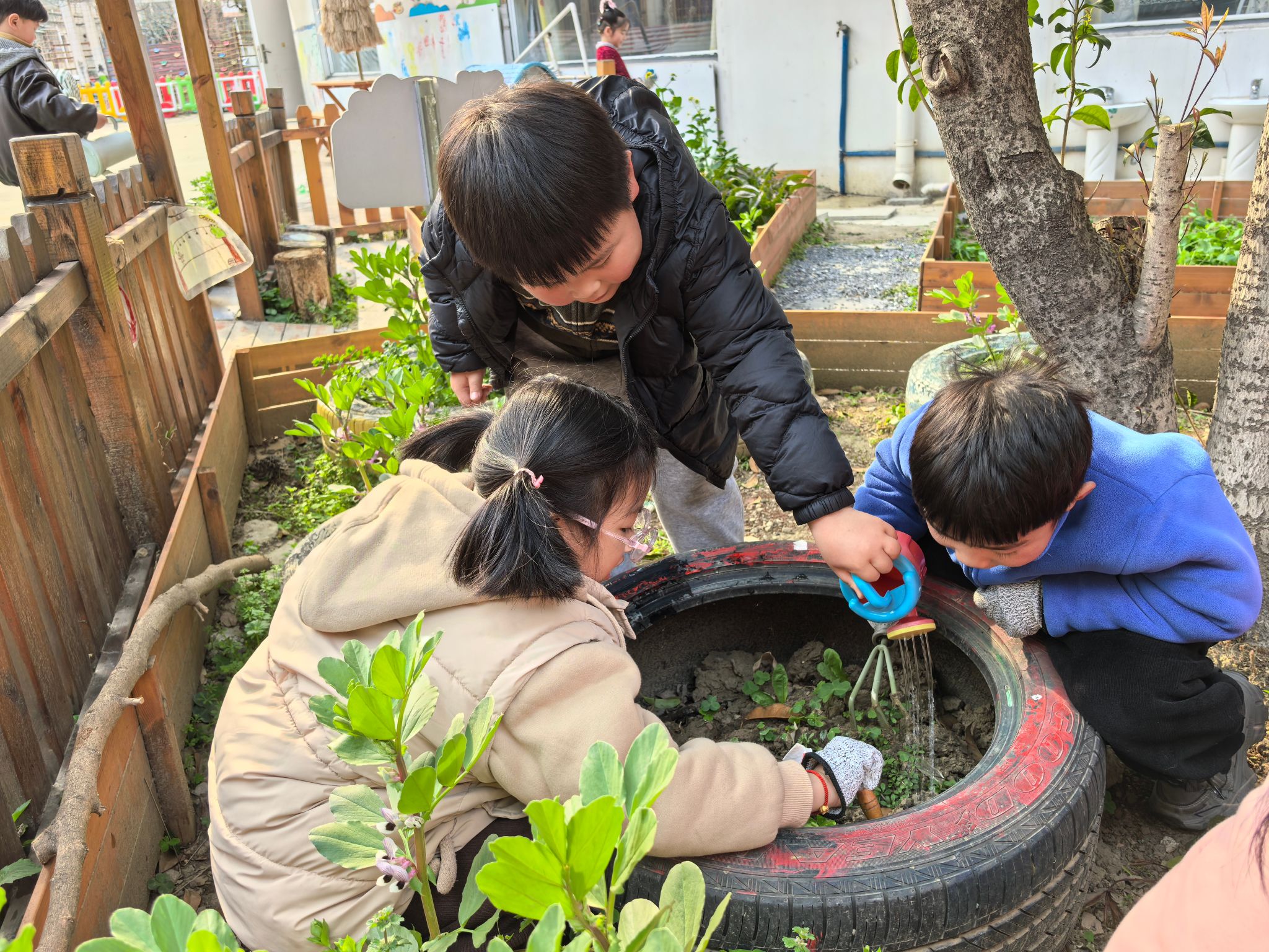 为了使孩子们充分了解有关树木的知识,了解植树节的来历及其意义。进一步了解树木与人类的密切关系,提高孩子们保护树木花草的责任感,增强爱护树木的能力,我班的孩子们走进种植园地,实地测量、标记种植点,在老师的指导下挖树坑,放置小苗,填土、浇水,合作完成种植任务。