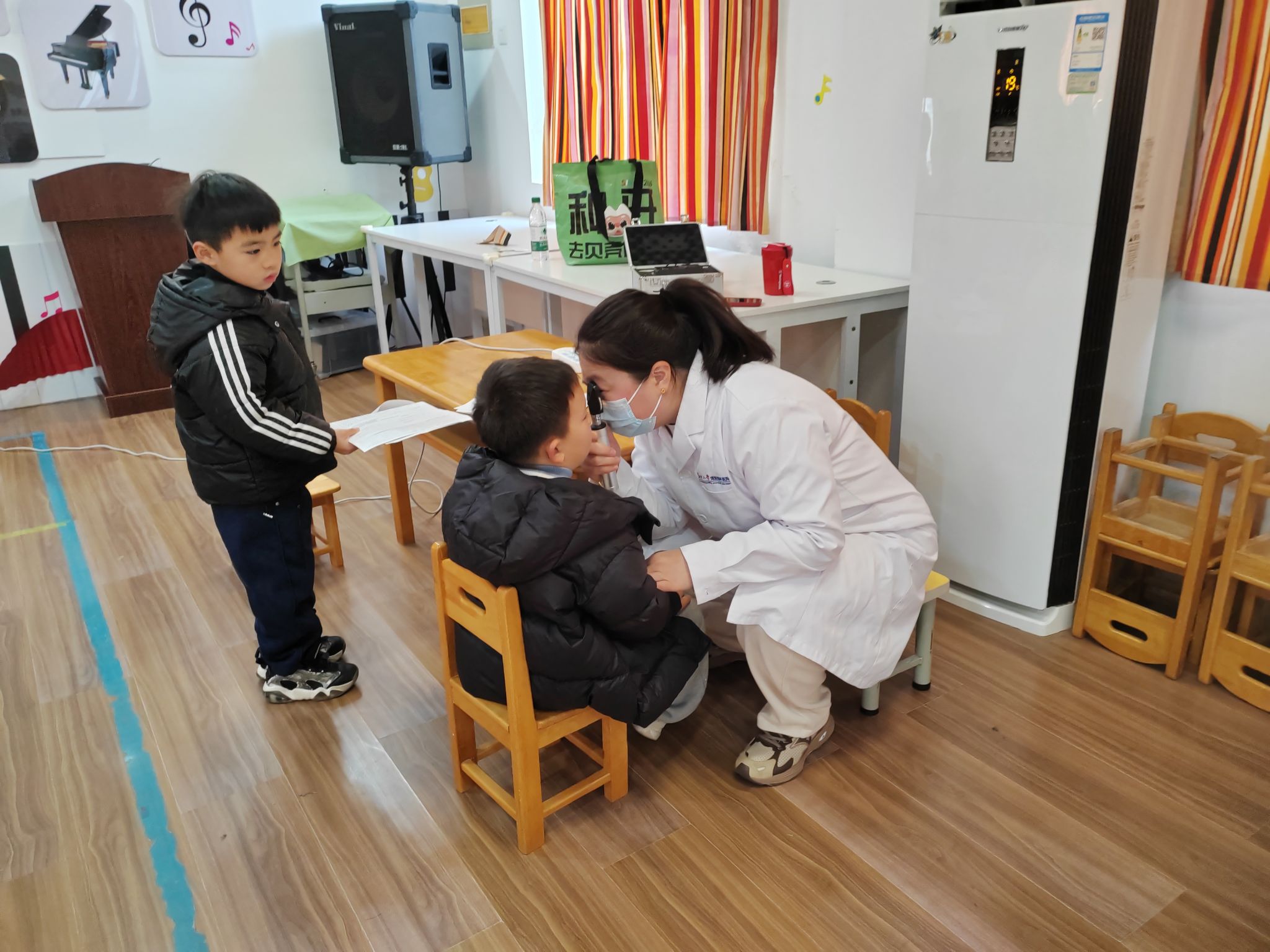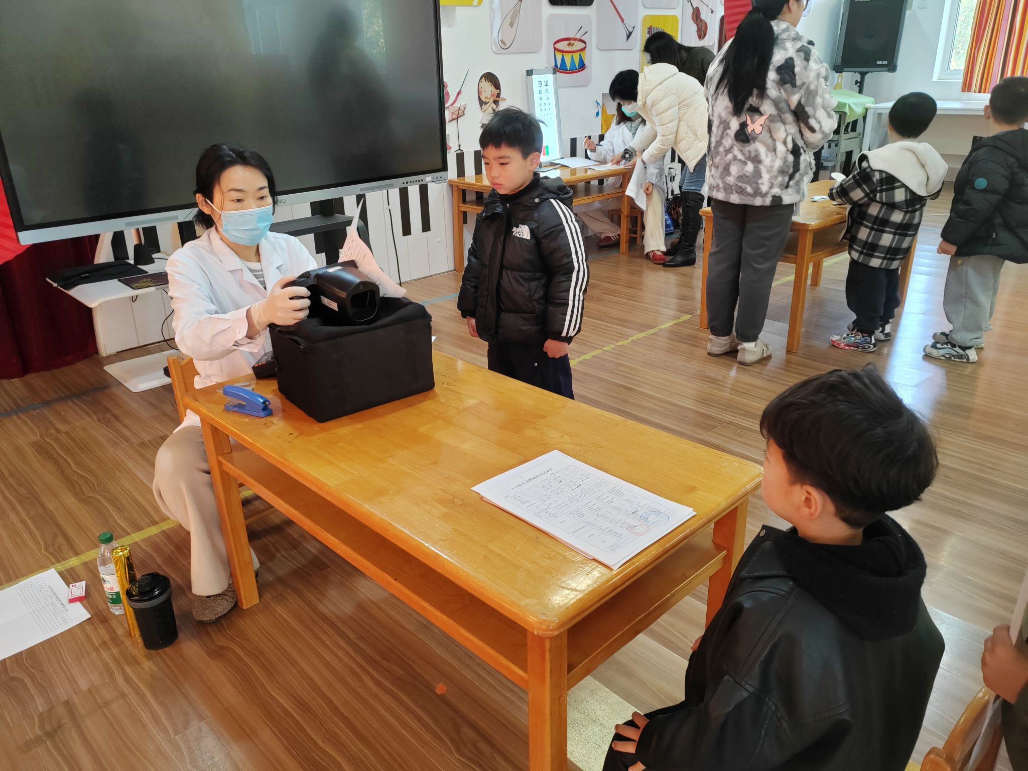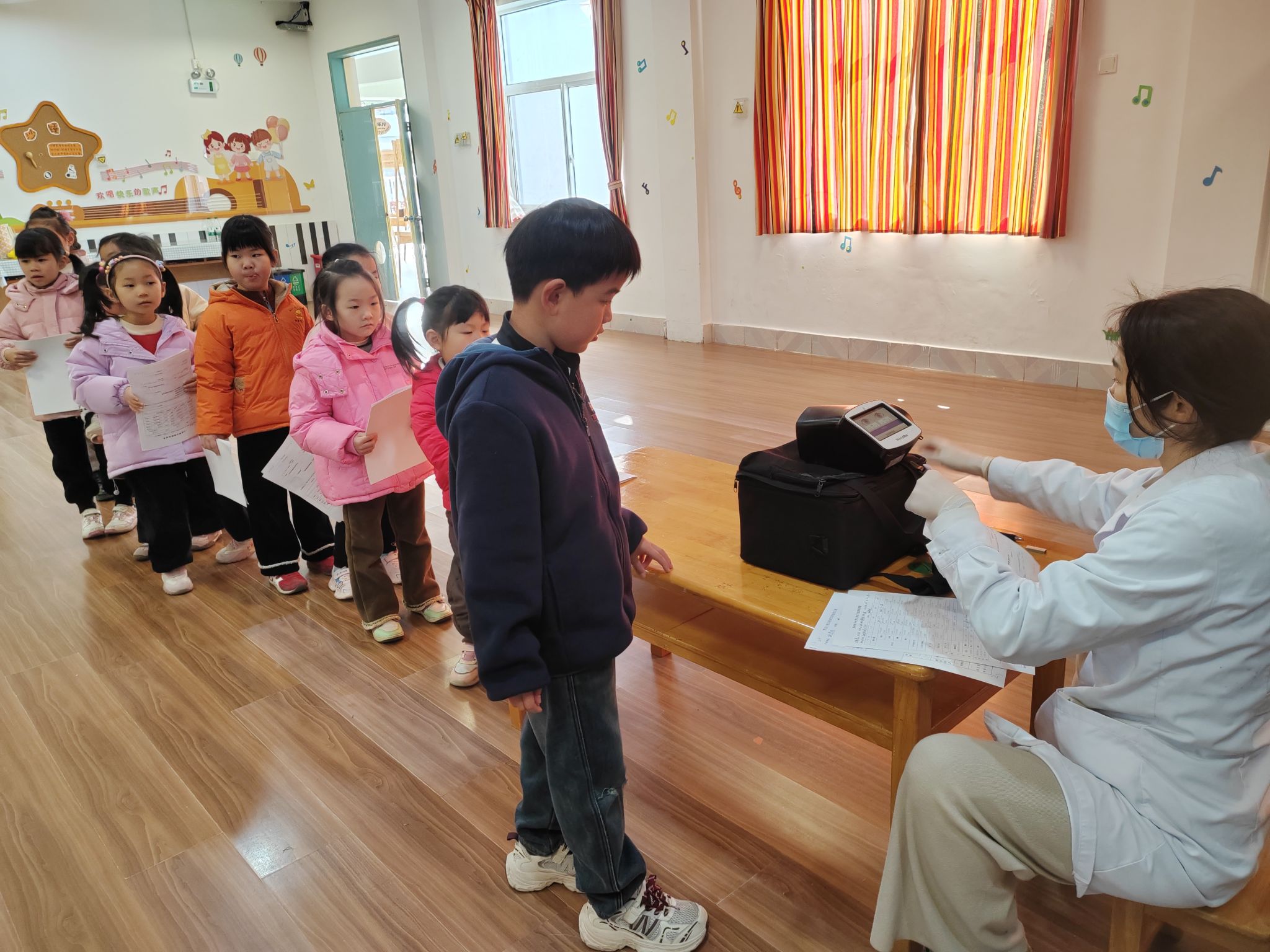 大一班的孩子们在医护人员和老师的组织下有条不紊地进行检查,医生们亲切、耐心地为每个孩子检查视力,小朋友们也都十分配合医生的检查工作。