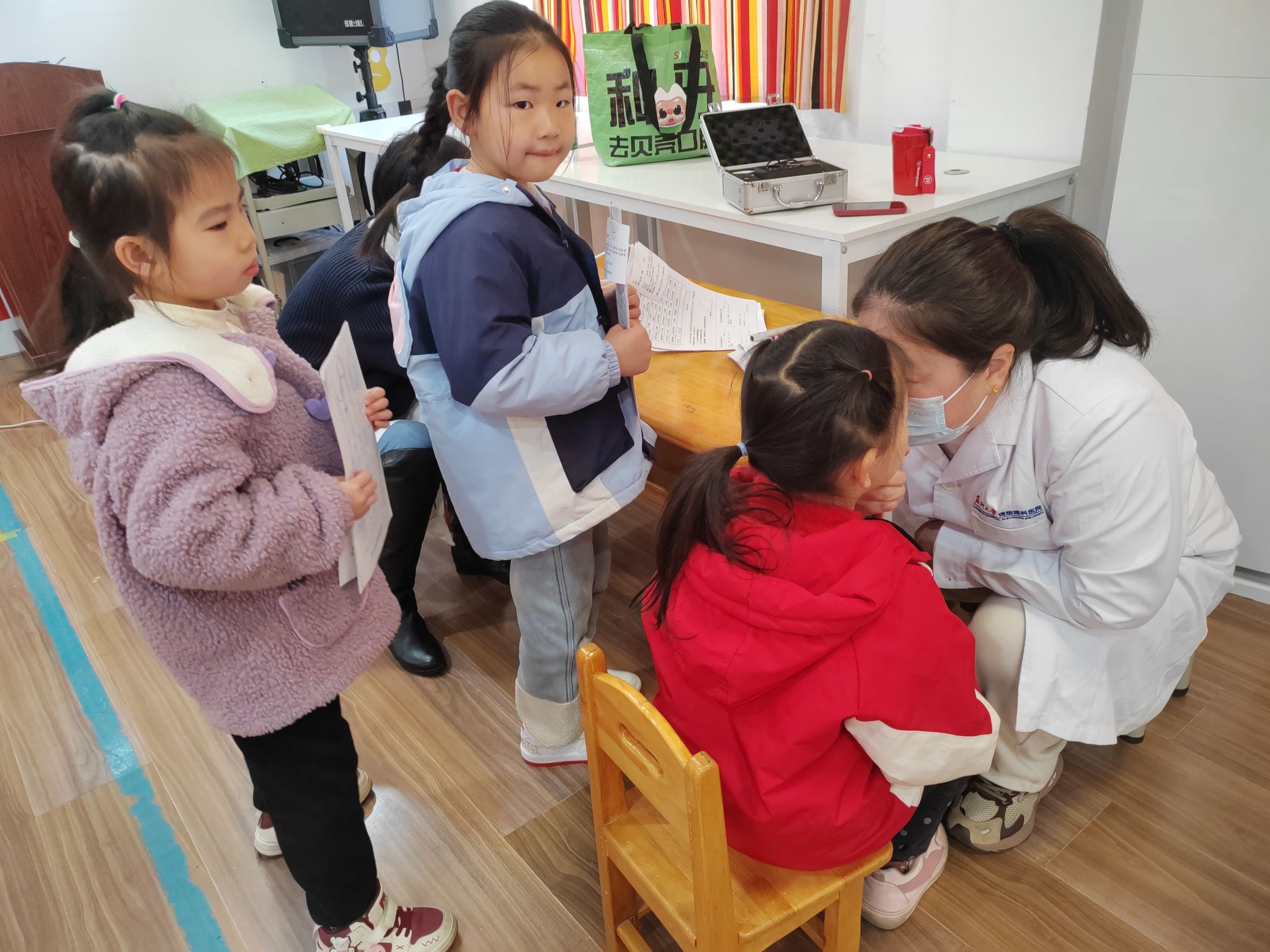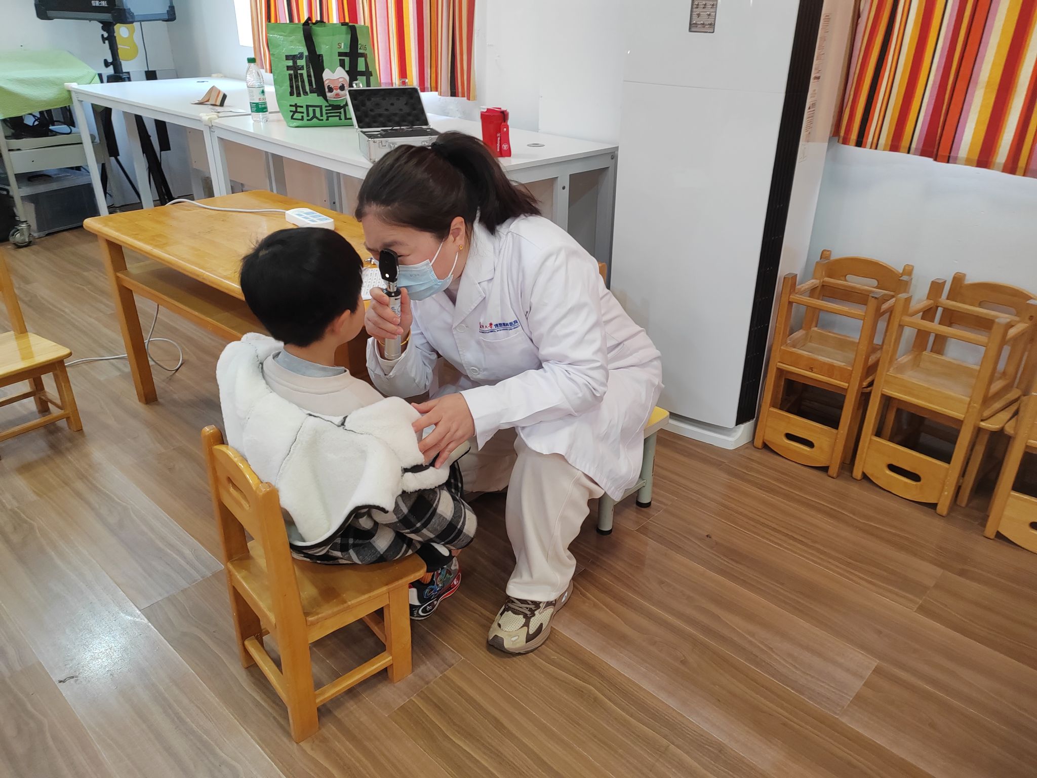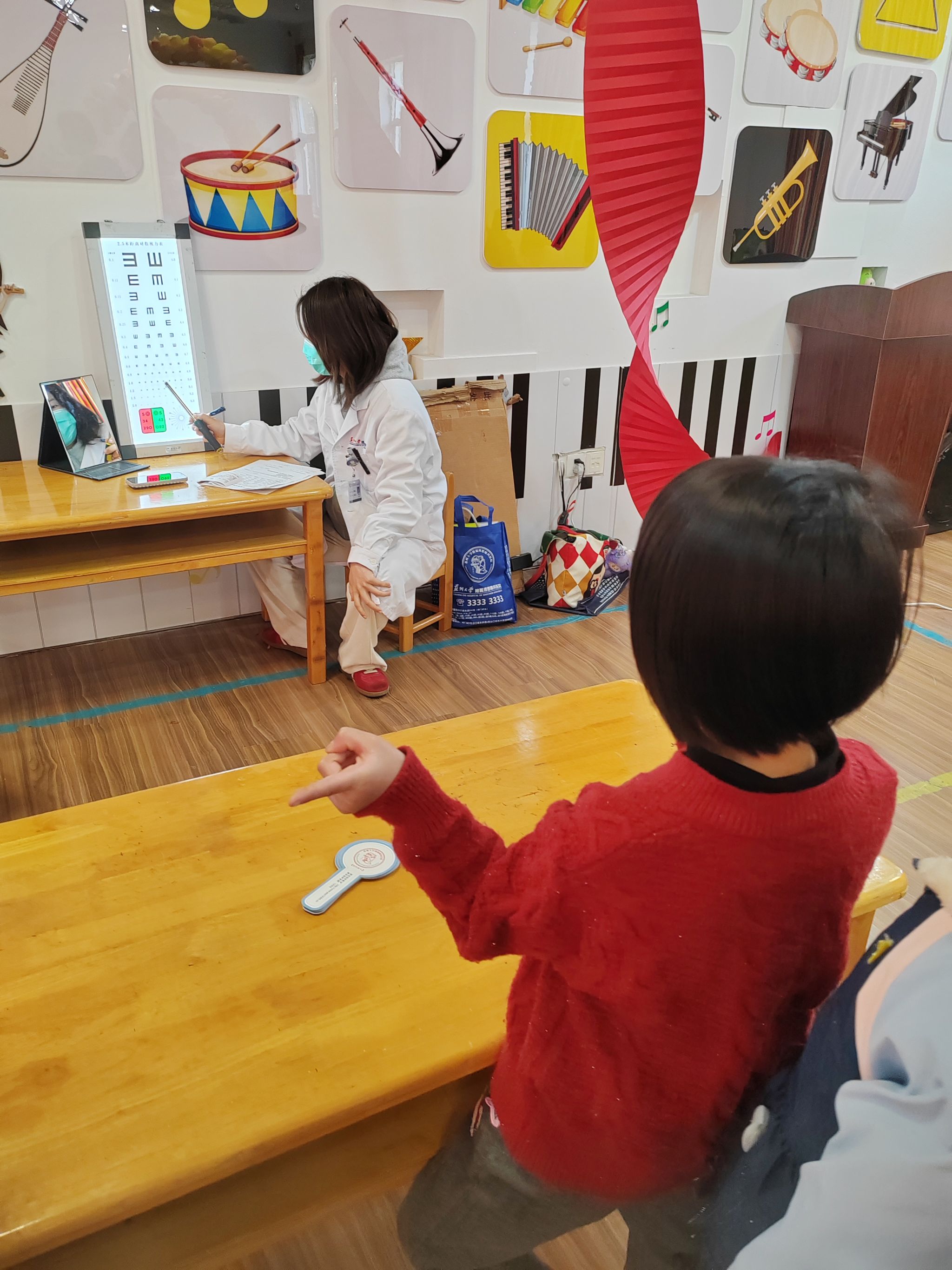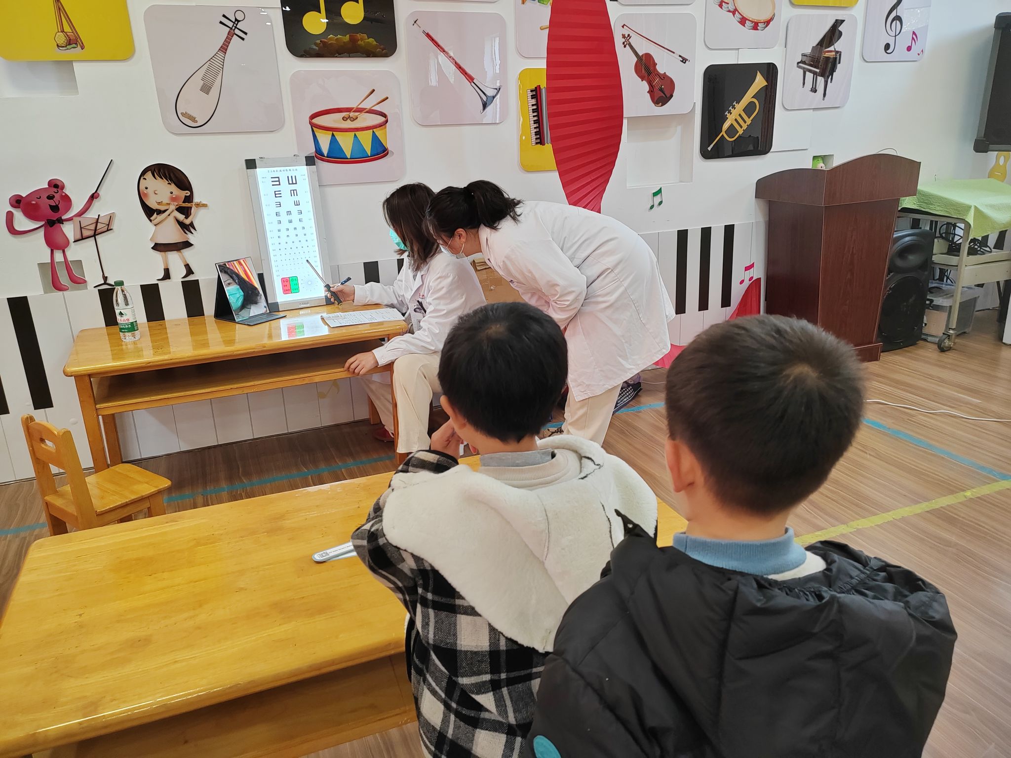大一班的孩子们在医护人员和老师的组织下有条不紊地进行检查,医生们亲切、耐心地为每个孩子检查视力,小朋友们也都十分配合医生的检查工作。