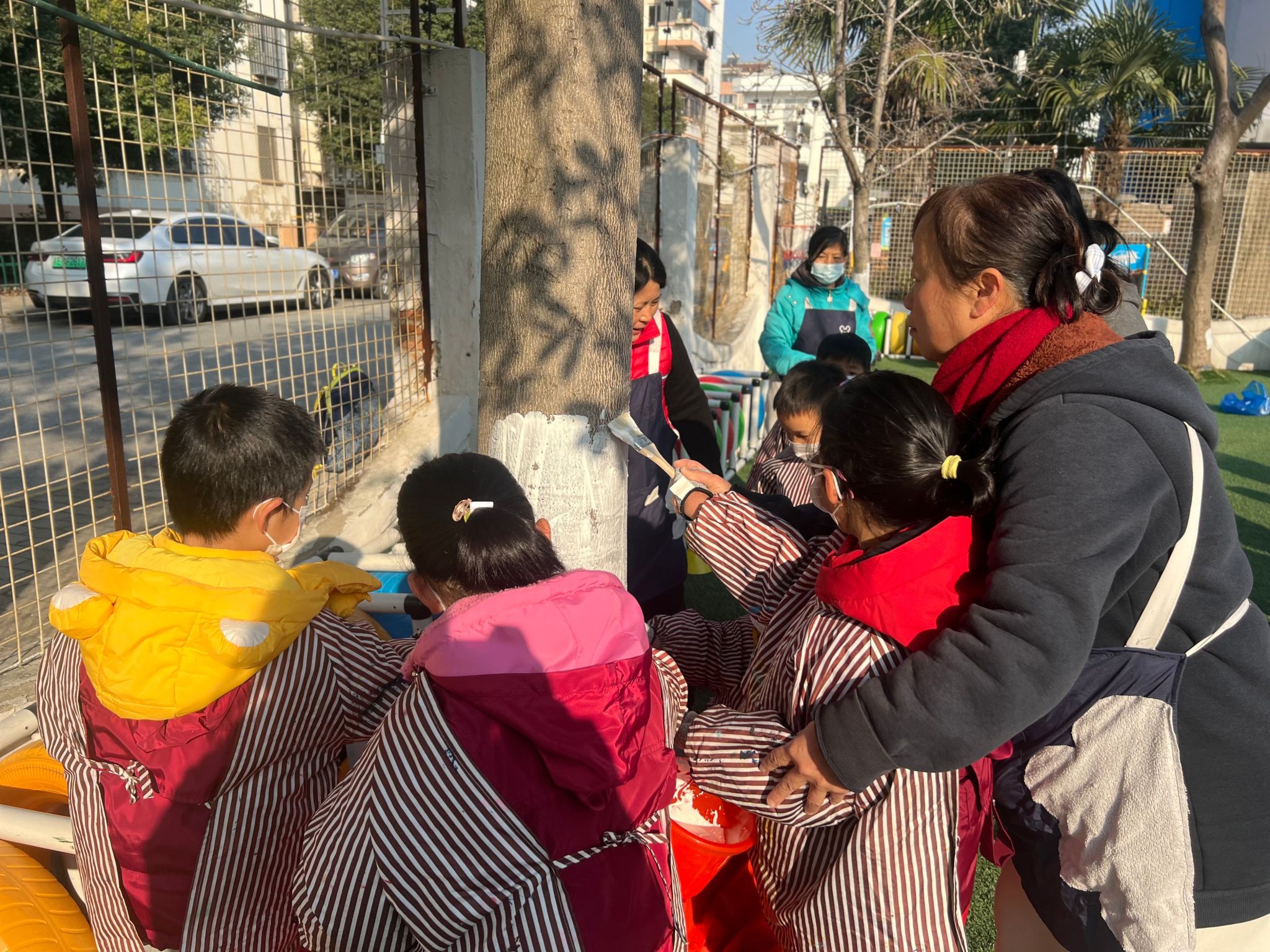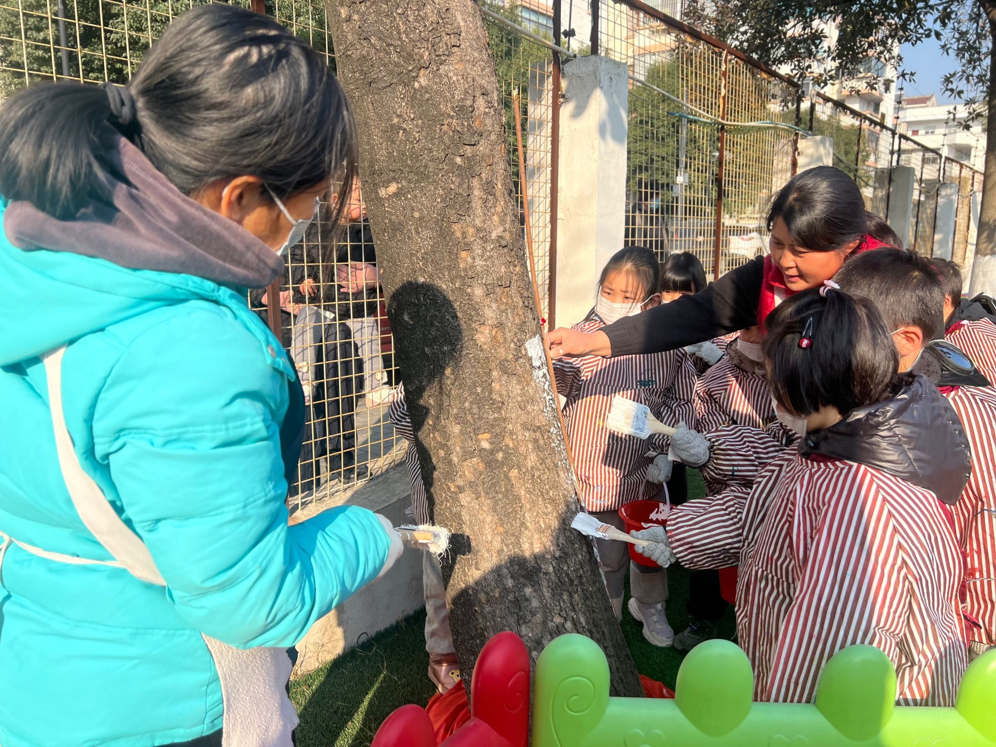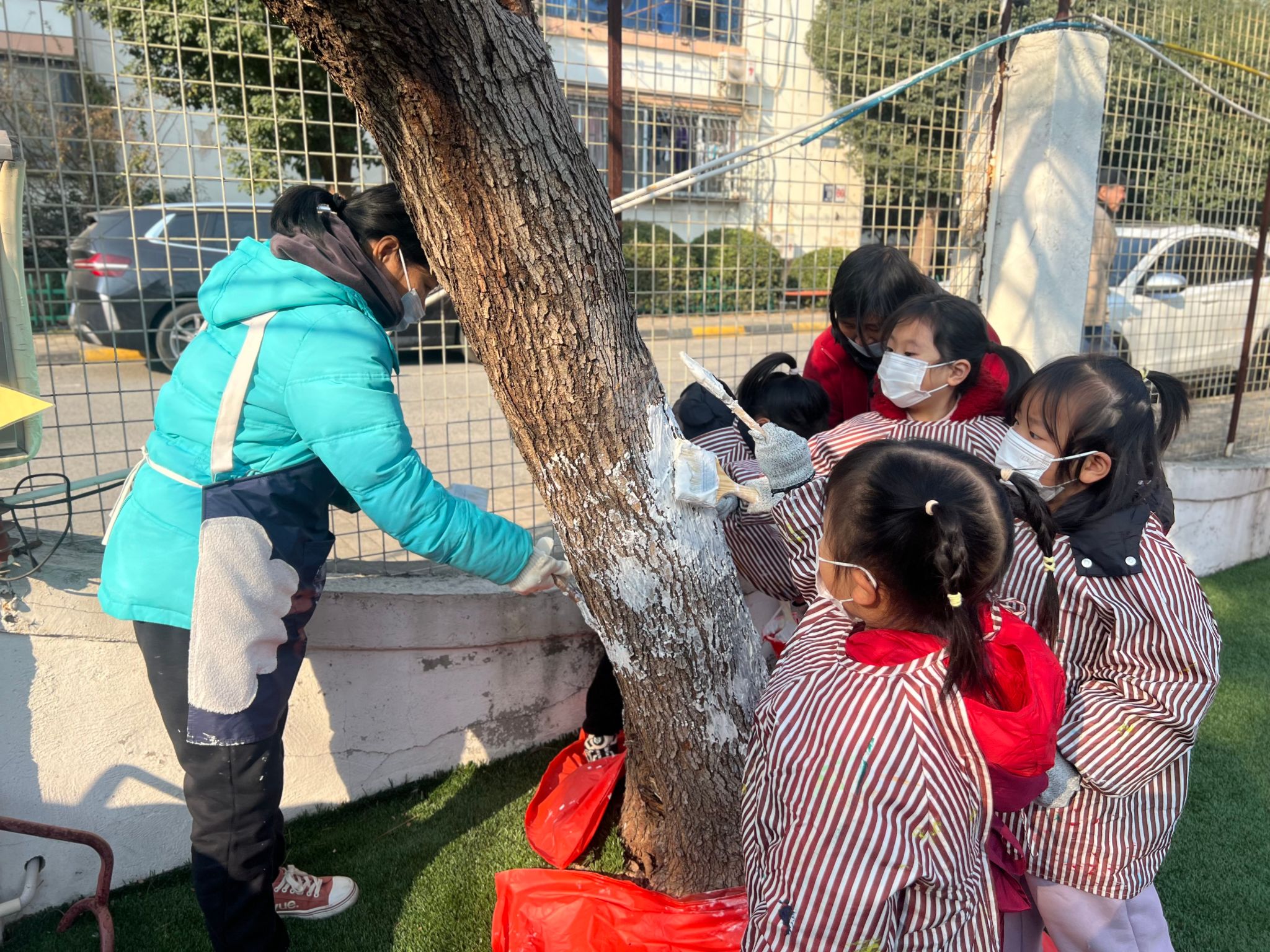 树叶飘然而下,冬天的进度条又拉满了一点。当初冬的风悄悄吹过,幼儿园的小树要如何度过这个冬天呢?教师们带领孩子们开展了一场关于“我给小树穿新衣”的主题教育活动,共同探讨交流如何给小树穿新衣。虽然天气寒冷,但孩子们的热情丝毫不减。活动中教师一边讲解,一边示范如何用石灰水给小树穿冬衣。孩子们跃跃欲试,兴奋、细心地为幼儿园的树木穿上了一件件“防寒衣服”。护一颗小树,暖一个冬天。通过此次活动,幼儿了解到树木御寒保暖的方法,用自己的方式关爱身边的树木。