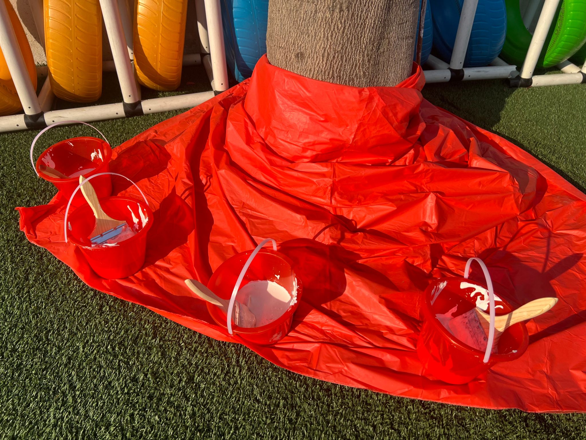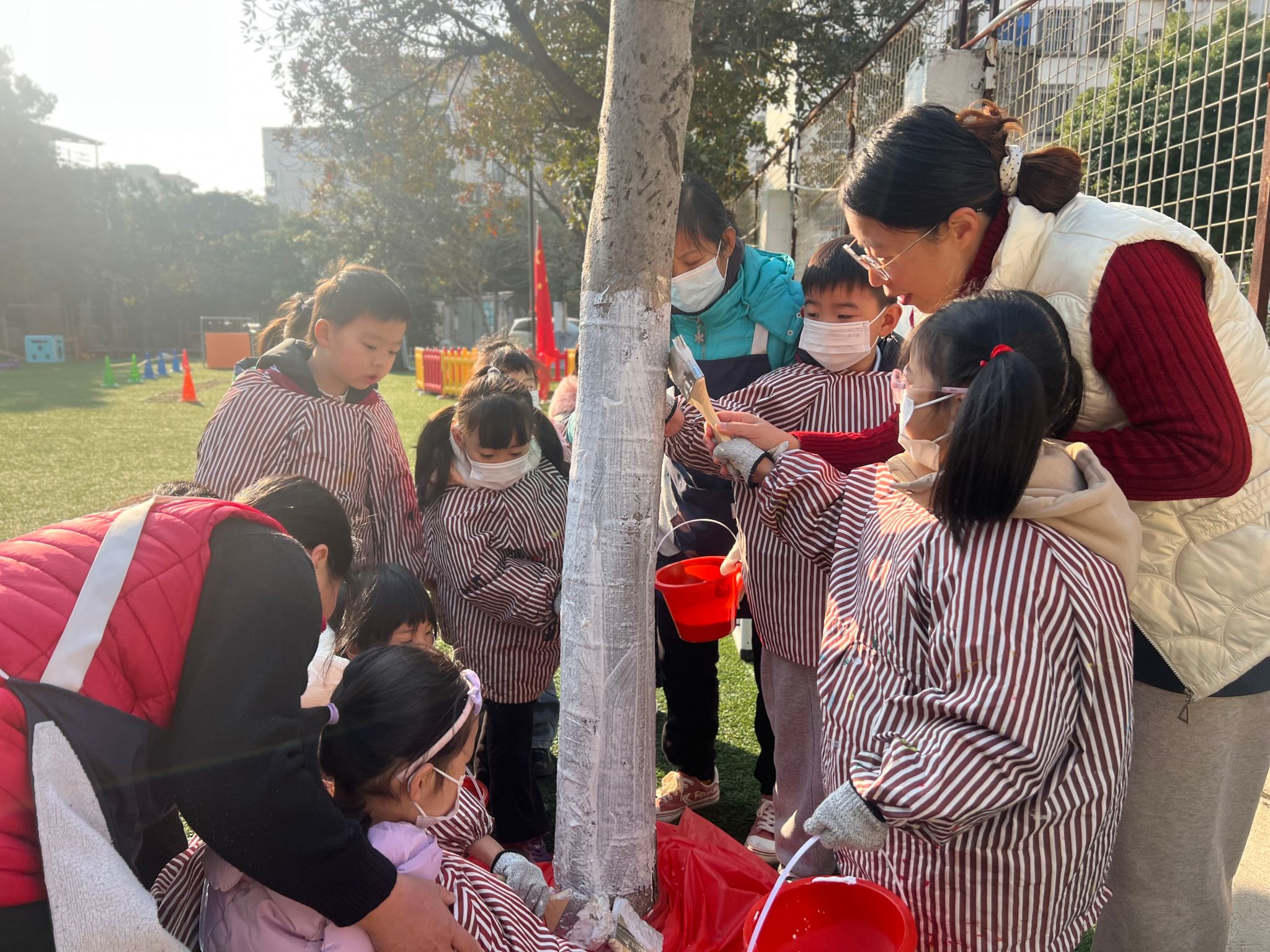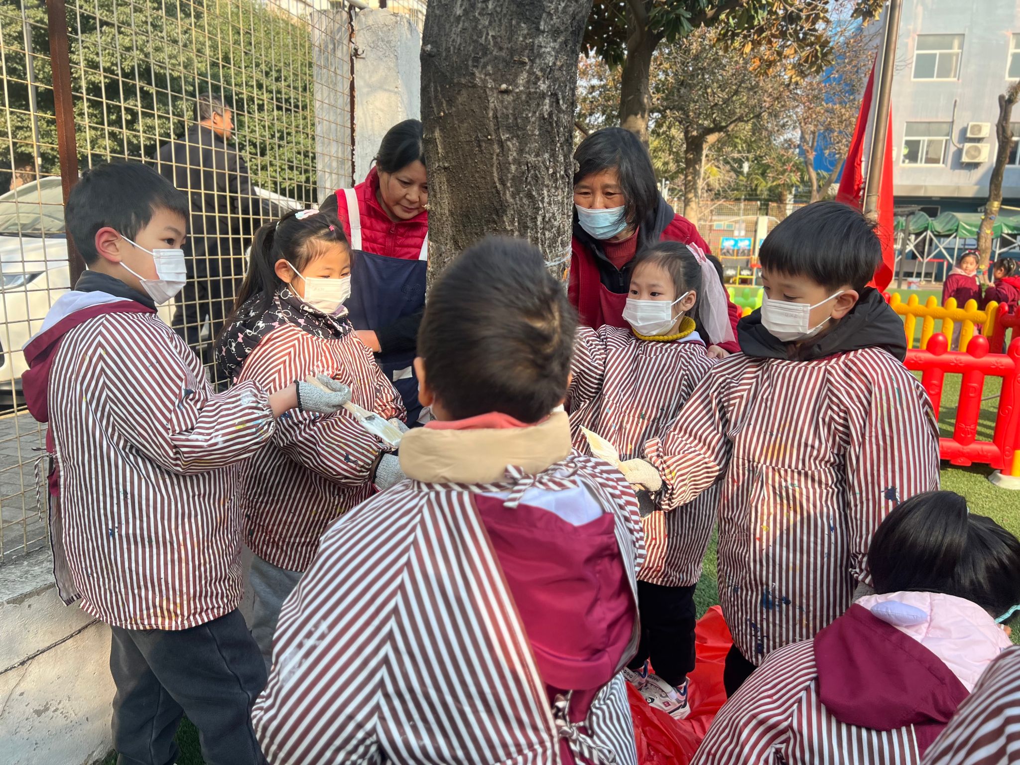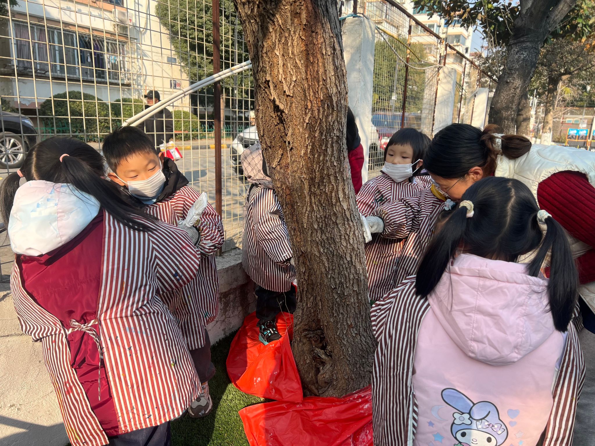 树叶飘然而下,冬天的进度条又拉满了一点。当初冬的风悄悄吹过,幼儿园的小树要如何度过这个冬天呢?教师们带领孩子们开展了一场关于“我给小树穿新衣”的主题教育活动,共同探讨交流如何给小树穿新衣。虽然天气寒冷,但孩子们的热情丝毫不减。活动中教师一边讲解,一边示范如何用石灰水给小树穿冬衣。孩子们跃跃欲试,兴奋、细心地为幼儿园的树木穿上了一件件“防寒衣服”。护一颗小树,暖一个冬天。通过此次活动,幼儿了解到树木御寒保暖的方法,用自己的方式关爱身边的树木。