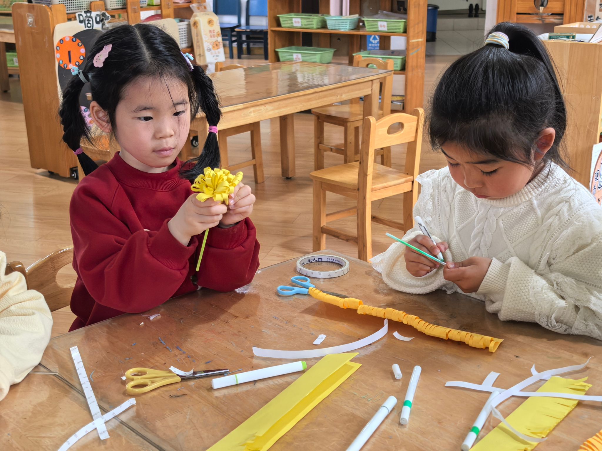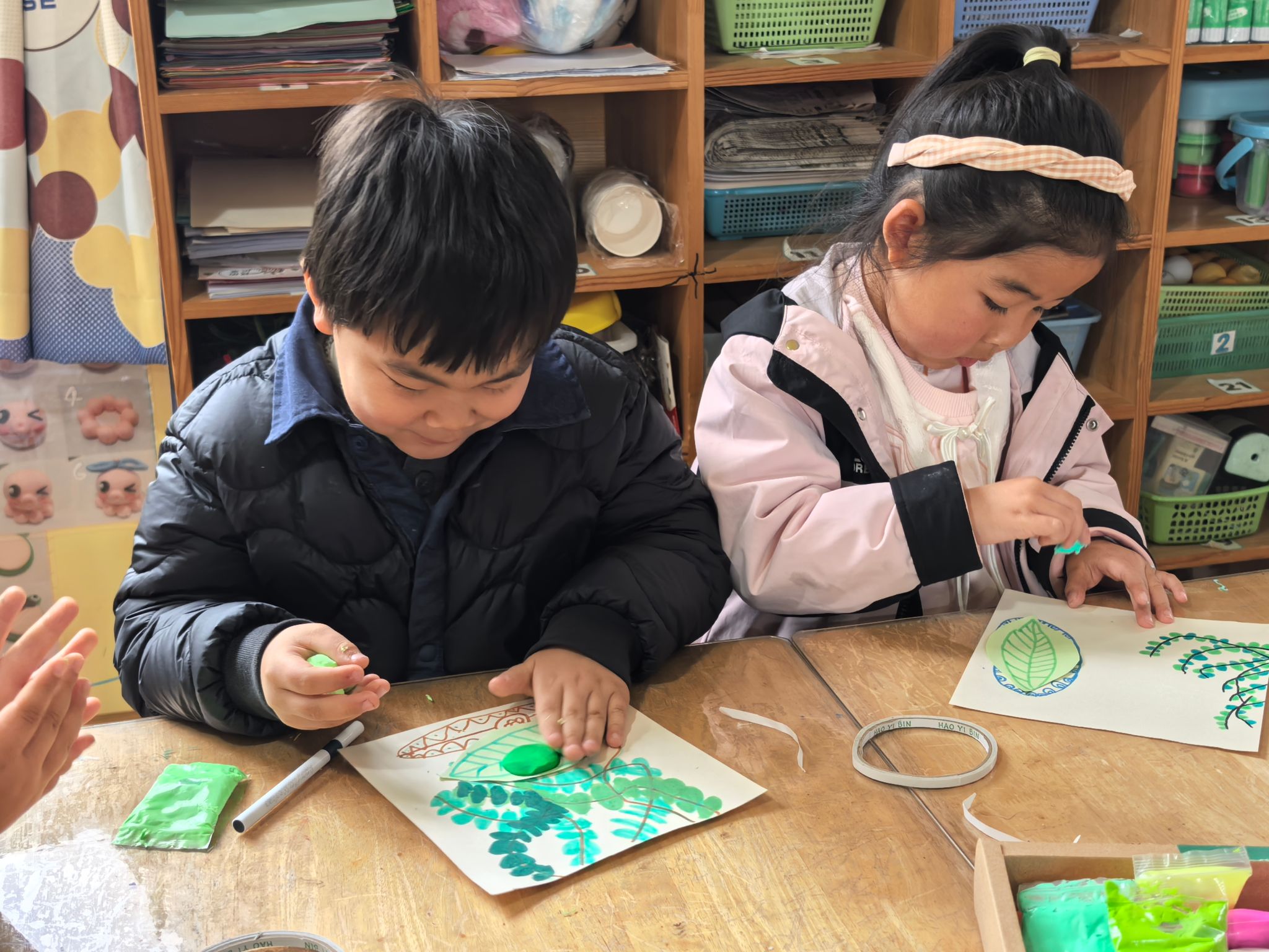 孩子们认真倾听,积极提问,在互动交流中,明白了清明节不仅是缅怀先辈、寄托哀思的日子,也是拥抱春天、感受自然的好时节。在美工区,孩子们化身小小艺术家,开启了青团创意画和菊花手工制作之旅,在动手实践中释放创意,寄托心意。孩子们拿起画笔,发挥想象,用绿色、黄色、白色等黏土,捏出了自己心中的青团