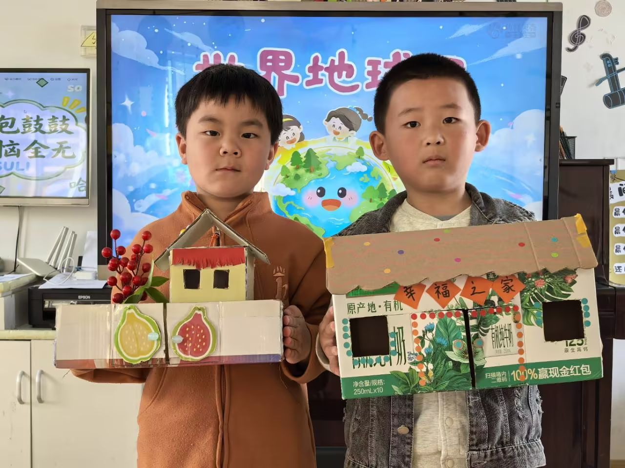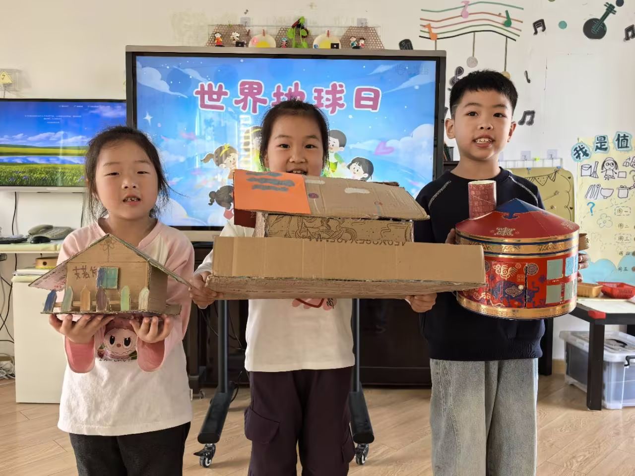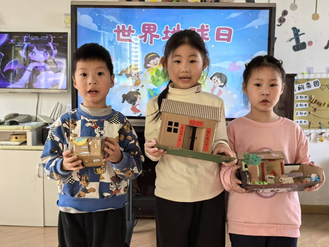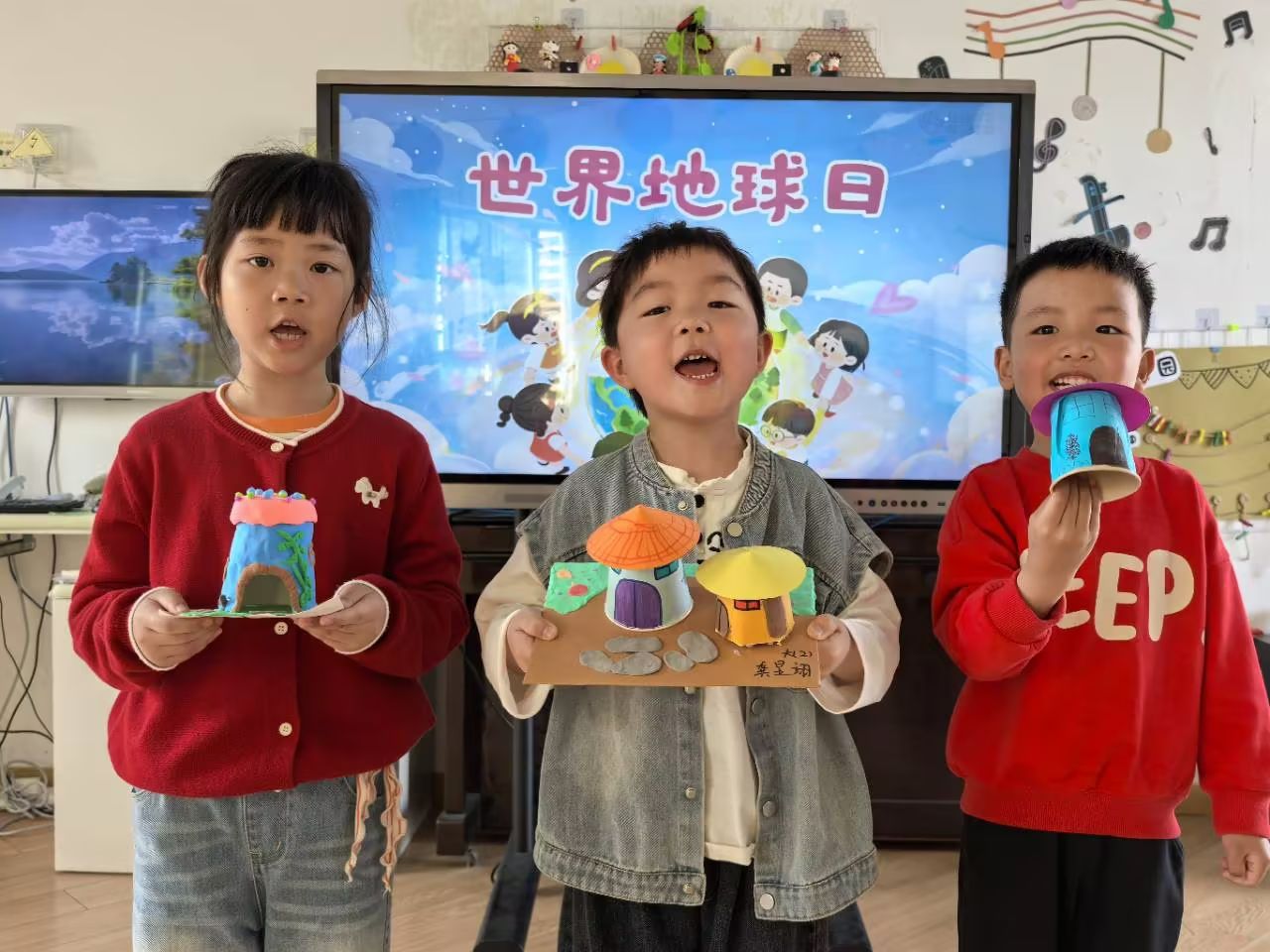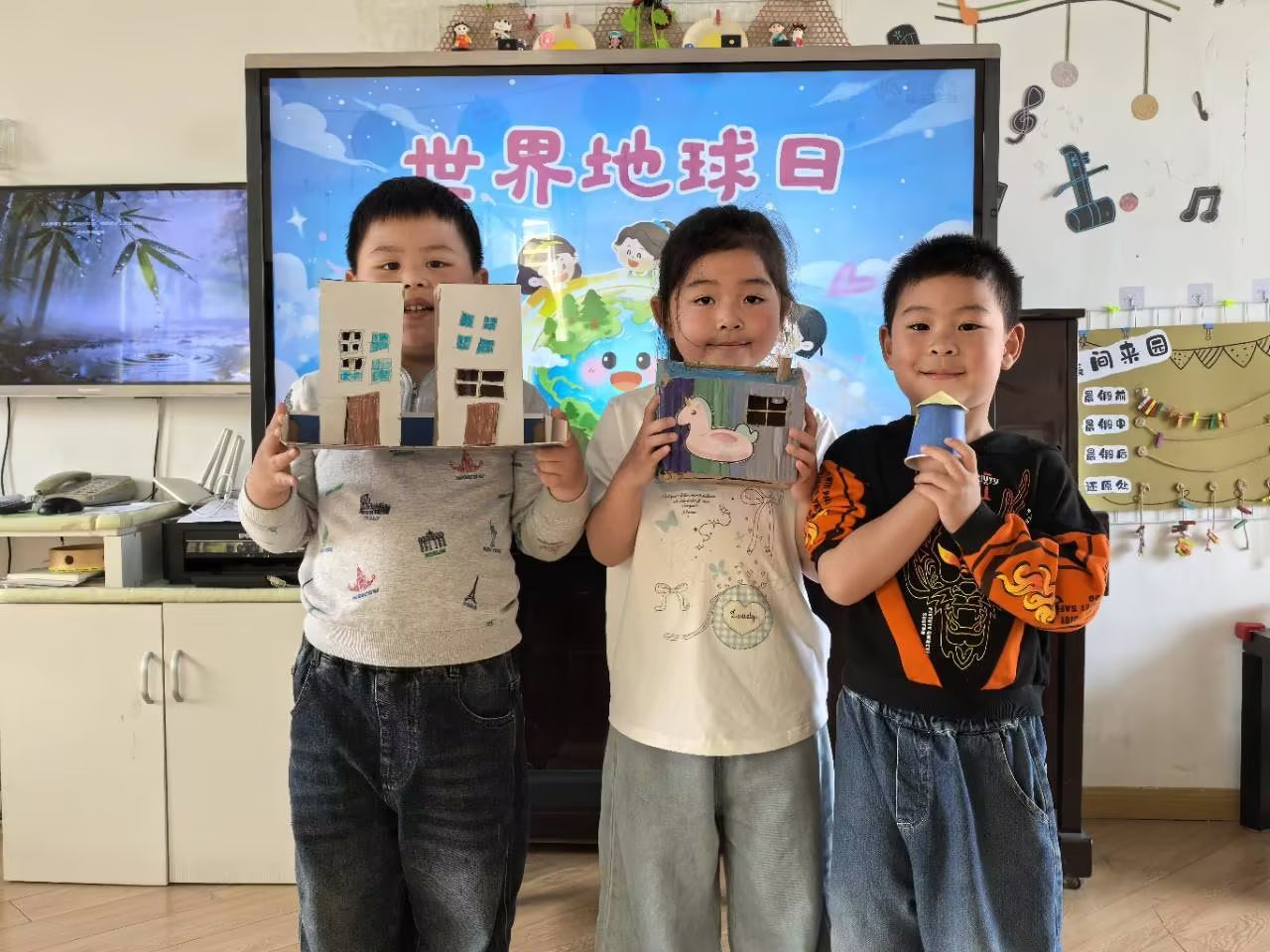 4月22日是世界地球日,为在孩子们心中种下环保的种子,引导他们学会珍惜地球资源,大二班开展了温馨有爱的世界地球日主题活动。孩子们用稚嫩又温暖的行动守护地球妈妈,争当环保小卫士,让绿色理念与文明风尚融入生活点滴。孩子们和爸爸妈妈一起用废旧纸箱、塑料瓶、废纸盒等废弃材料制作小房子,在孩子们的巧思与巧手下,一件件创意手工作品,不仅展现了孩子们的奇思妙想,更让大家真切领悟到变废为宝的环保意义。