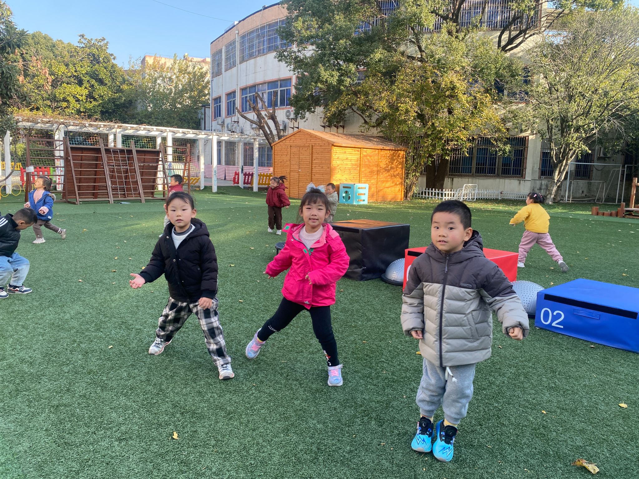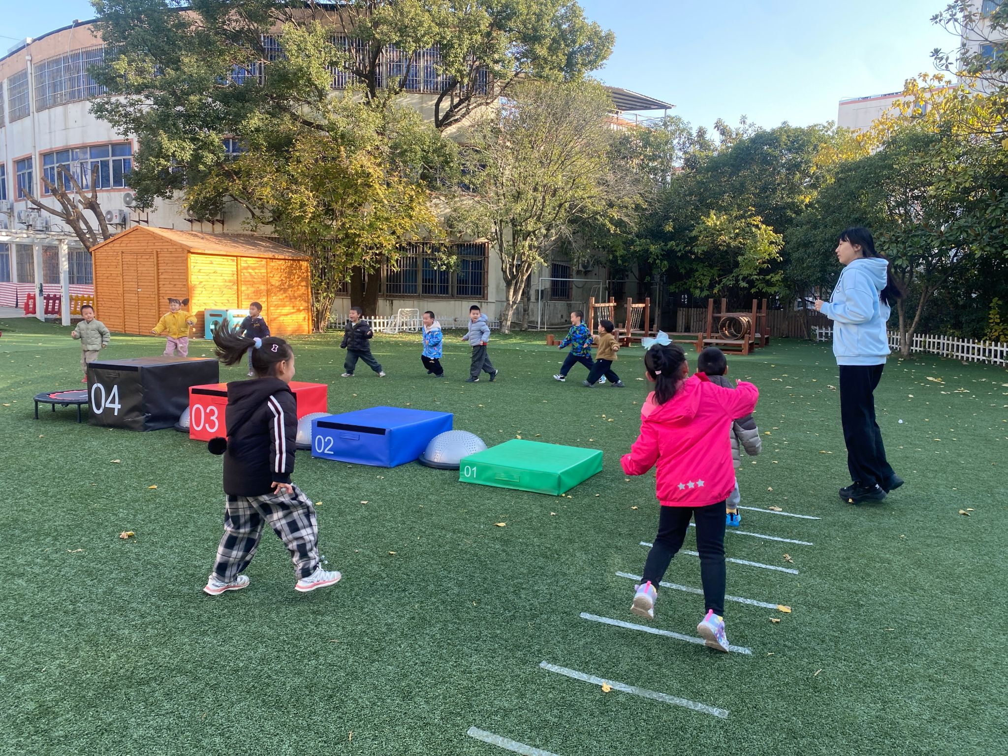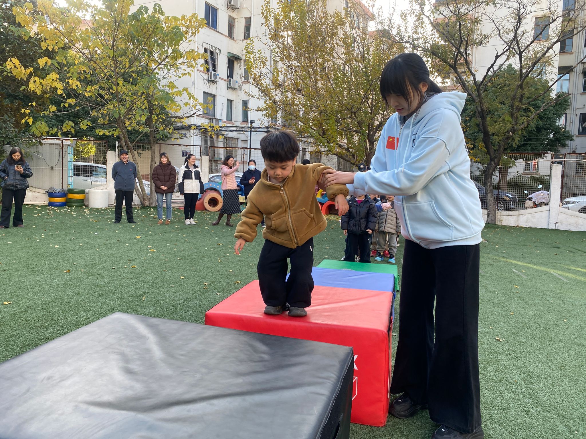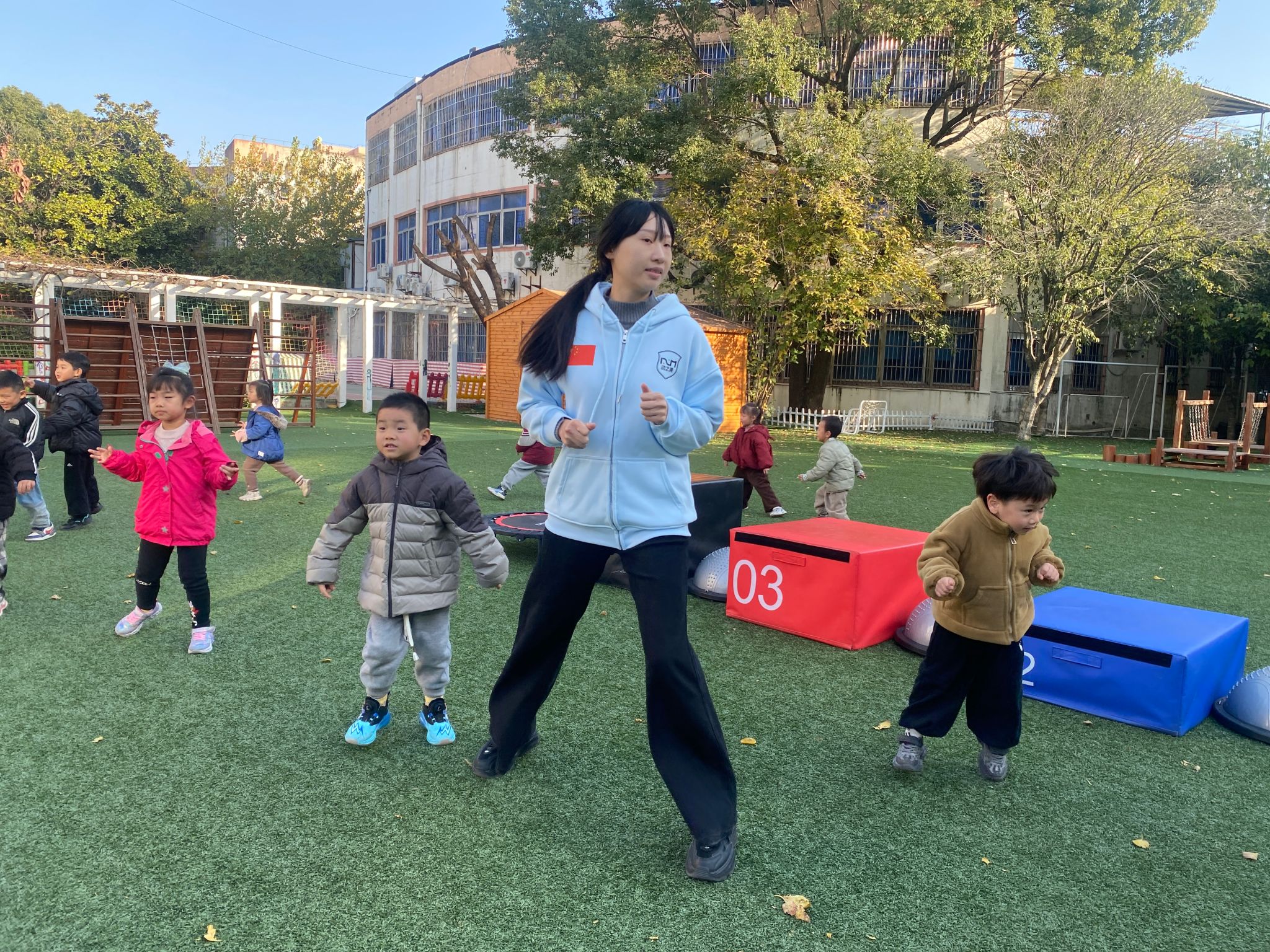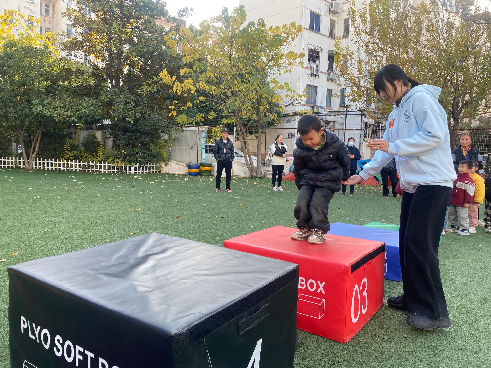 【第三个项目:跳箱】 休息一下喝口水,接下来是最后一个挑战:跳箱!这些箱子是小山坡,我们学小袋鼠跳过去。看示范:双脚并拢蹲一蹲,手臂后摆,用力向前跳,双脚轻轻落在垫子上站稳。