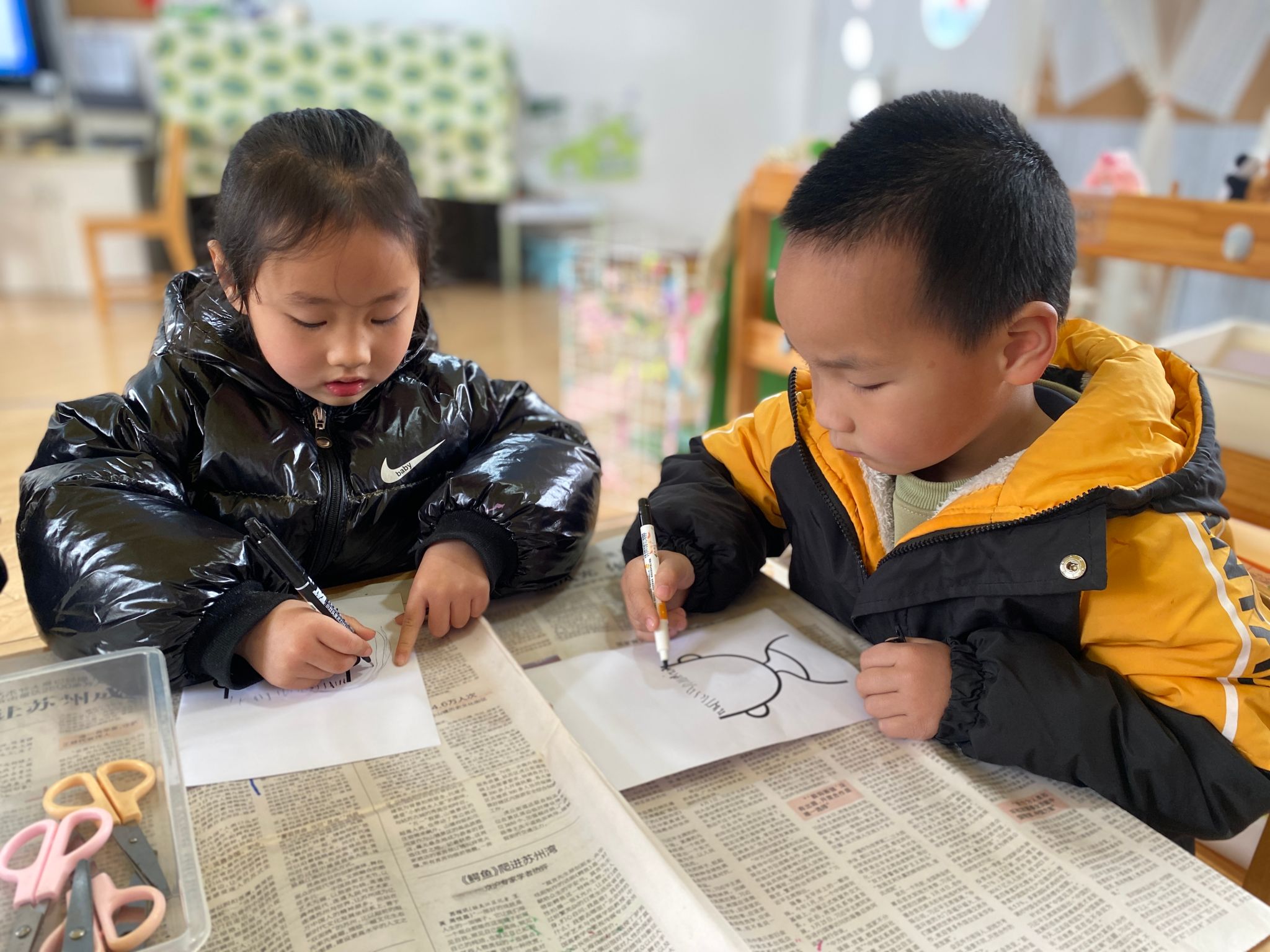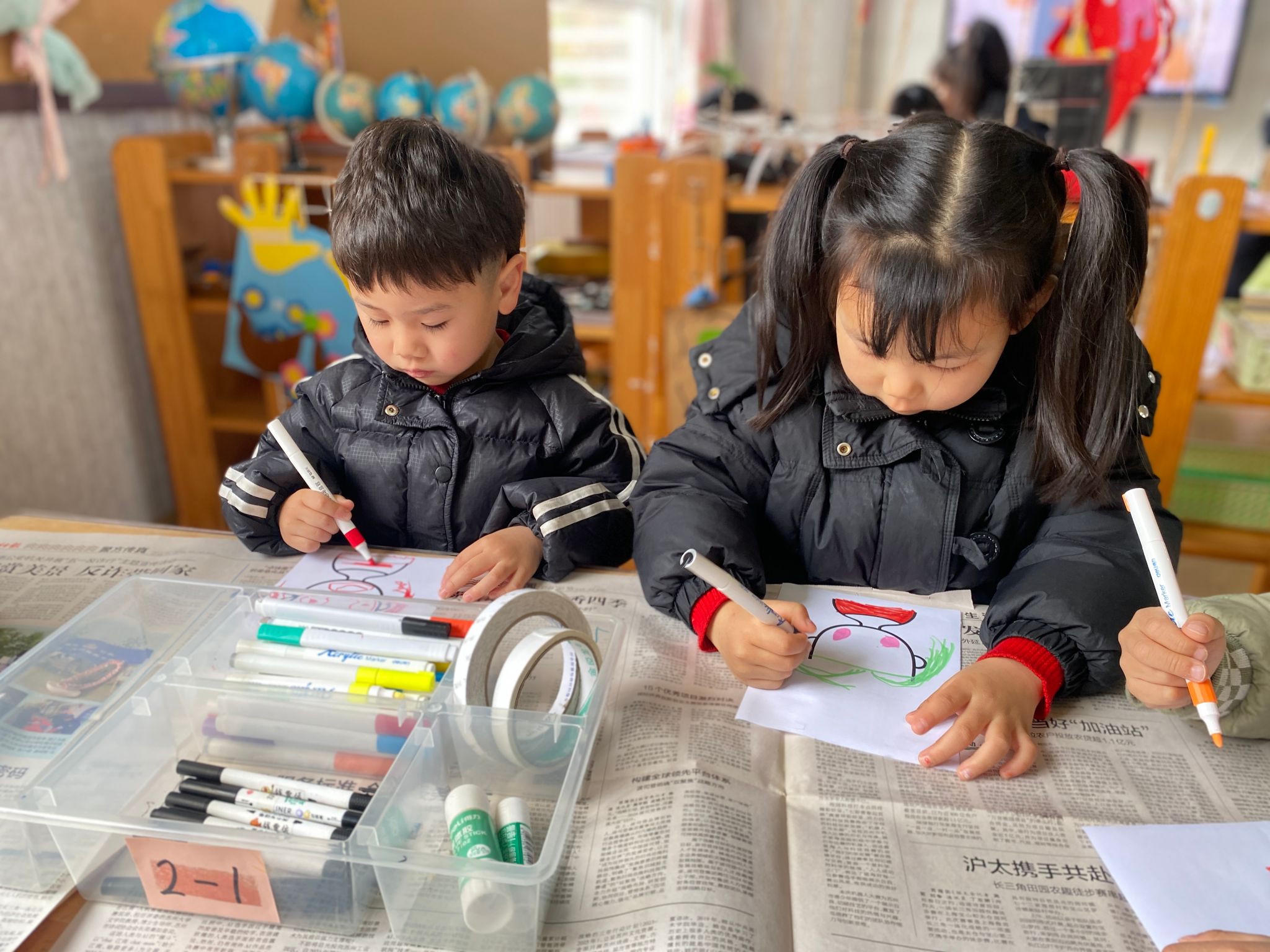 活动现场,一张张画纸铺满了桌面,小宝贝们的小脑袋凑在一起,认真地勾勒着妈妈的样子。
