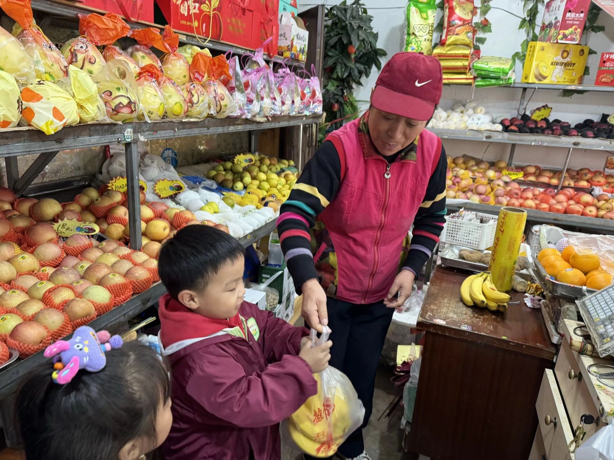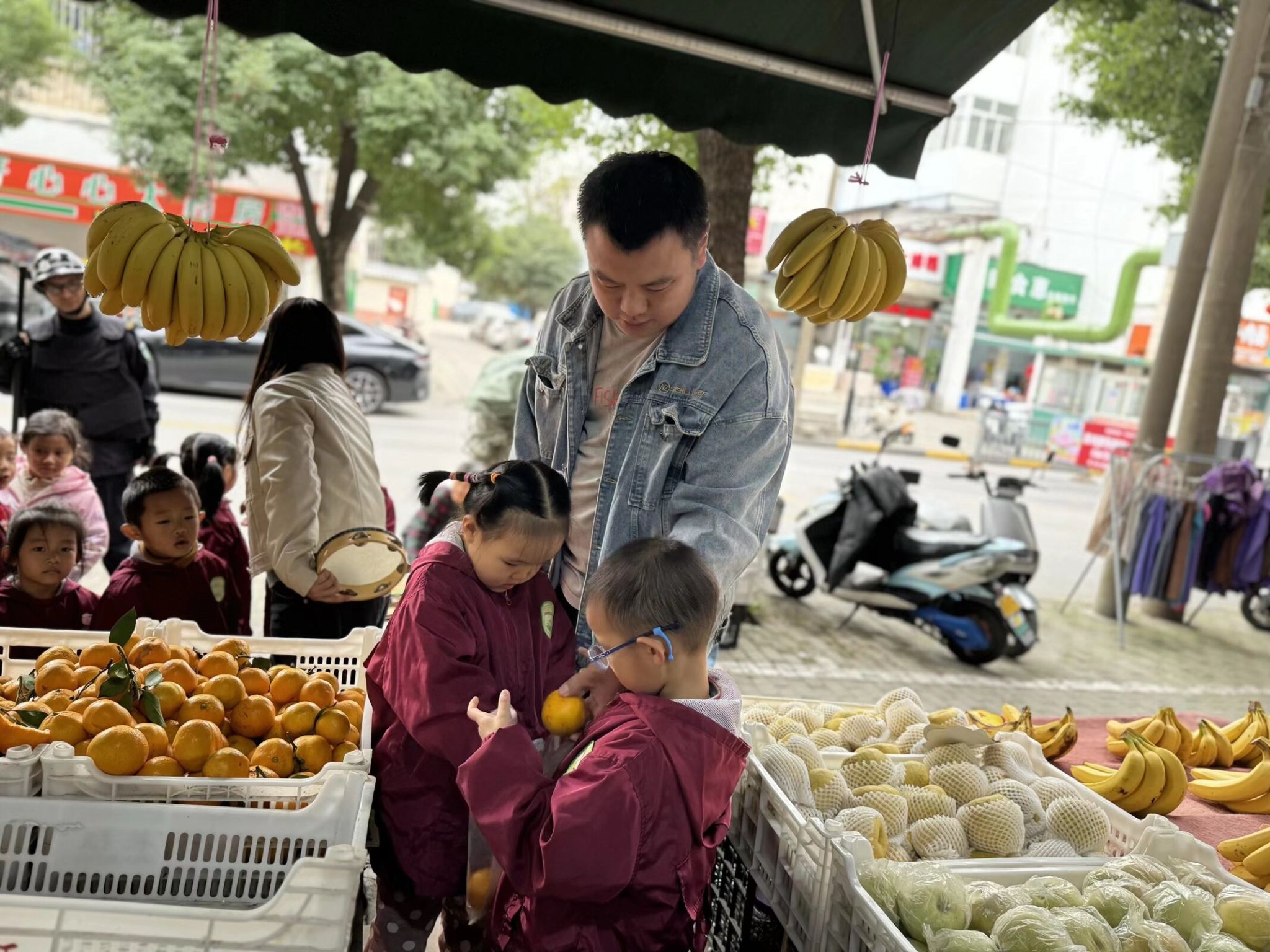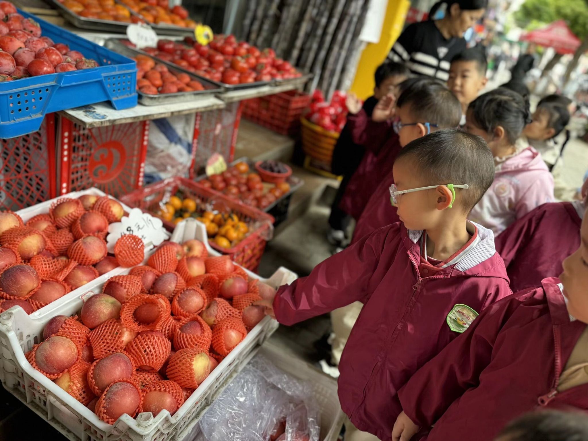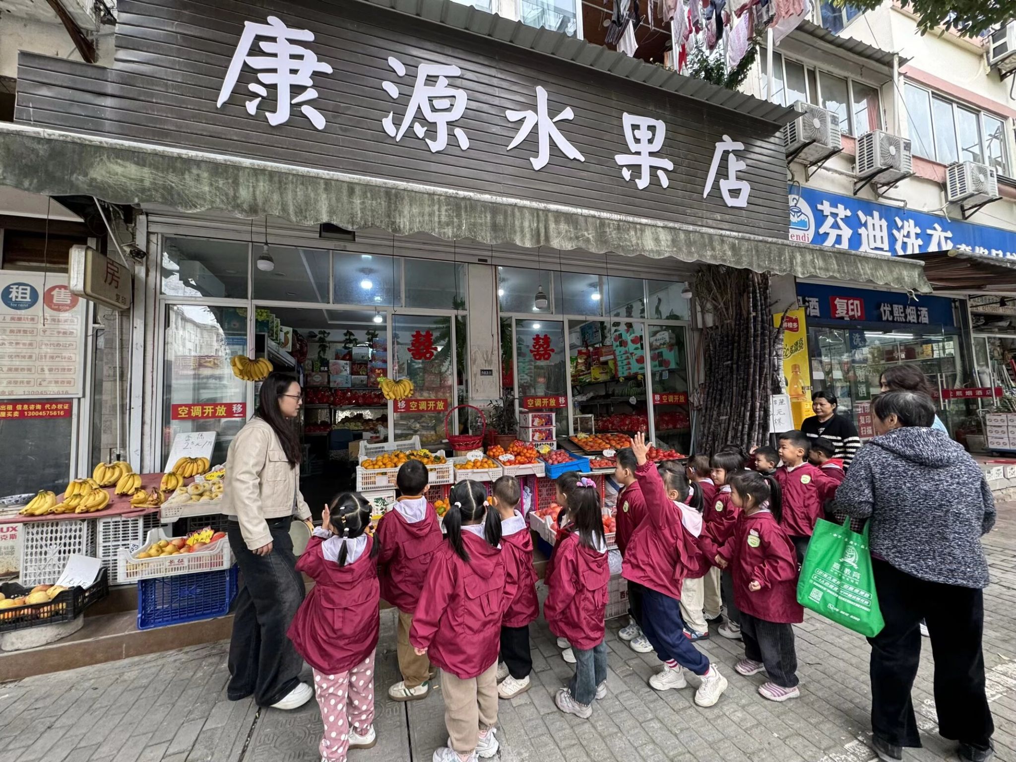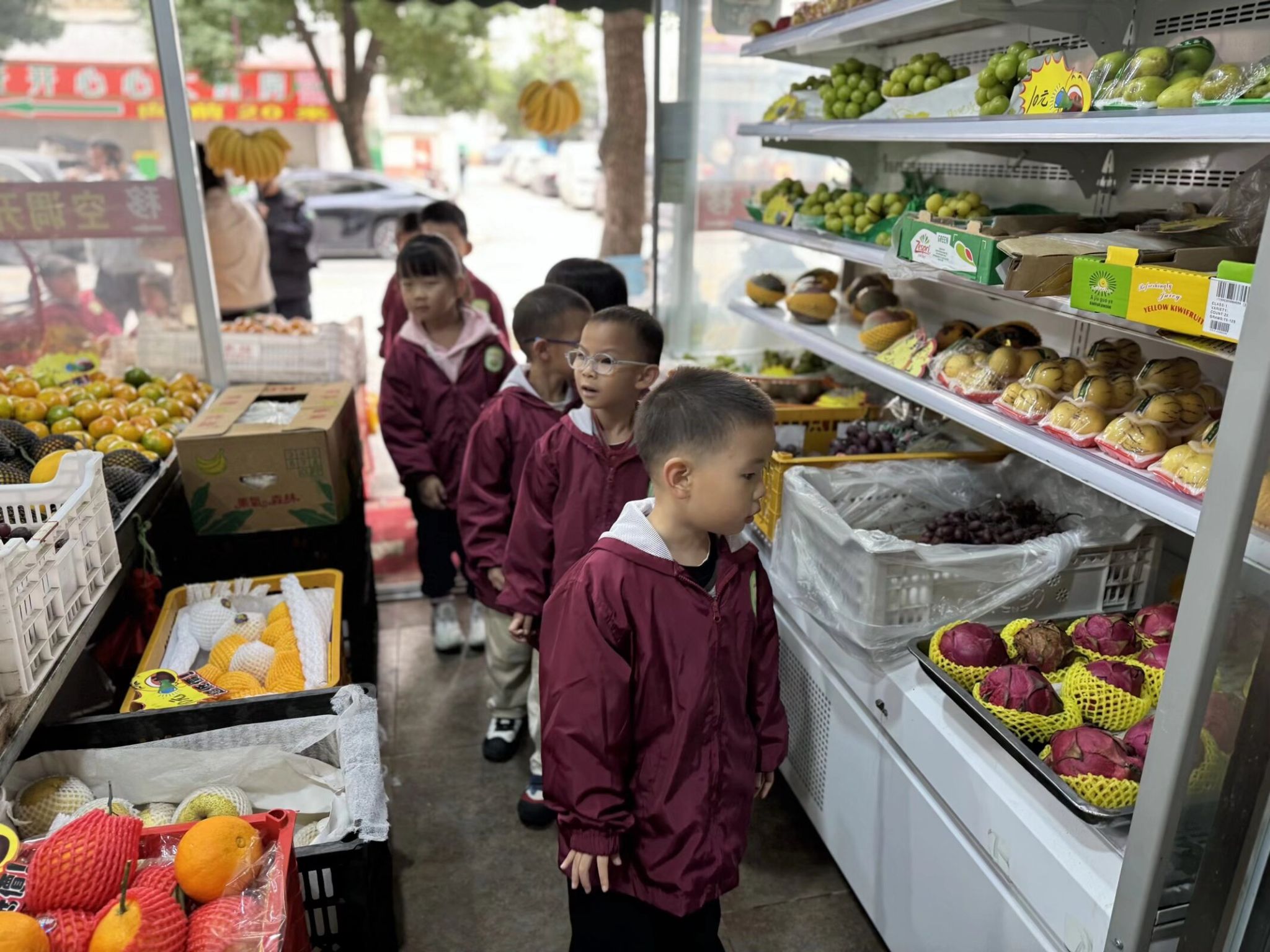 生活即课堂,实践促成长。为了让中班宝贝们贴近生活、感知自然,我们带着一群 4-5 岁的小可爱走进了家门口的水果店,开启了一场充满果香的社会实践之旅。一踏入水果店,五颜六色的水果瞬间吸引了宝贝们的目光,每一样都让孩子们忍不住驻足打量。在老师的引导下,宝贝们学着用眼睛看、用小手摸、用鼻子闻,认真分辨不同水果的外形、颜色和气味,叽叽喳喳地分享着自己的发现,满是好奇与欢喜。活动中,宝贝们不仅认识了十余种常见水果,遇到不认识的水果,大家主动举手提问,大胆表达想法,在轻松的氛围里锻炼了观察力、表达力和社交力。小小的水果店,藏着大大的学问。这场贴近生活的社会实践,让中班宝贝们在亲身体验中收获知识,在快乐探索中感受生活的美好。往后我们也会带着孩子们走进更多生活场景,让教育自然发生,让成长看得见!